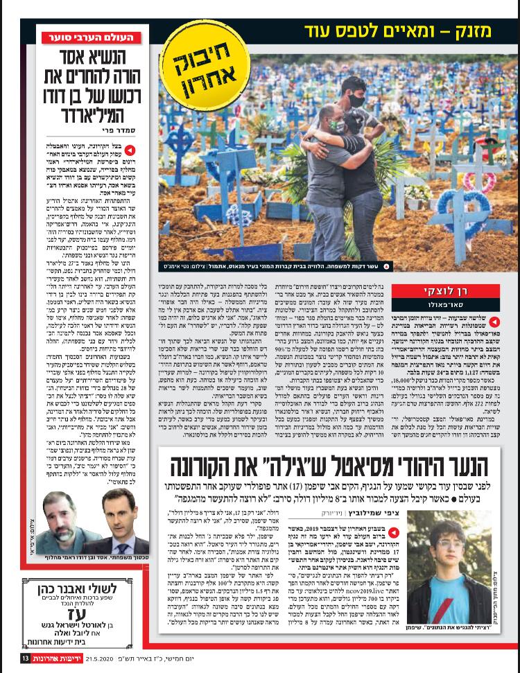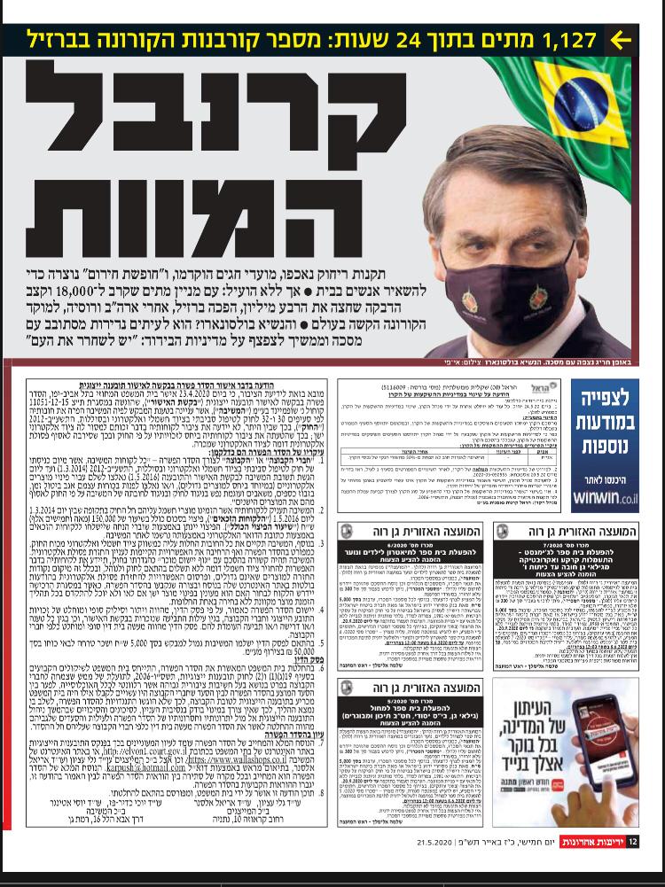 Esse é o título da matéria de hoje (21/05) no maior jornal israelense, Yedioth Ahronoth, para se referir ao Brasil e às medidas do governo Bolsonaro no contexto da pandemia do coronavírus.